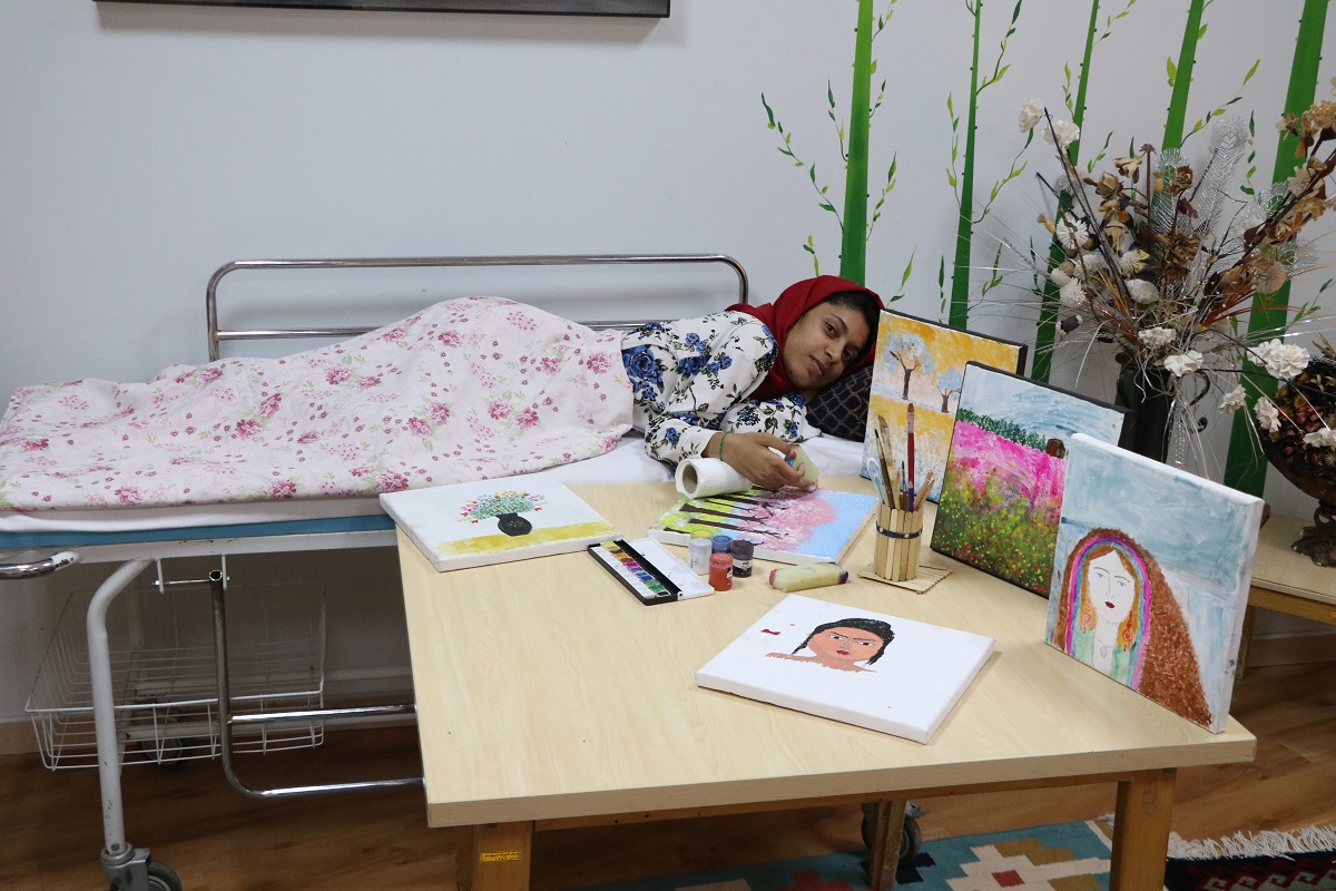 بیش از یک سال است که خانه های توانبخشی ویژه ی افراد دارای معلولیت جسمی و حرکتی دخترانه و پسرانه بنیاد خیریه سپهر با ظرفیت 24 نفر راه اندازی شده است. این توانخواهان از خدمات توانبخشی و مراقبت به صورت شبانه روزی بهره می گیرند. حدیث عضوی از این خانه هاست که به هنر نقاشی علاقه دارد. او با وجود معلولیت شدید جسمی، قلم هنر را به رخ ناتوانایی هایش می کشد.