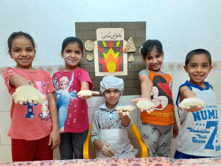 آموزش مراحل پخت نان به صورت نمادین در خانه شادی با هدف آشنایی فرزندان با شغل نانوایی انجام شد