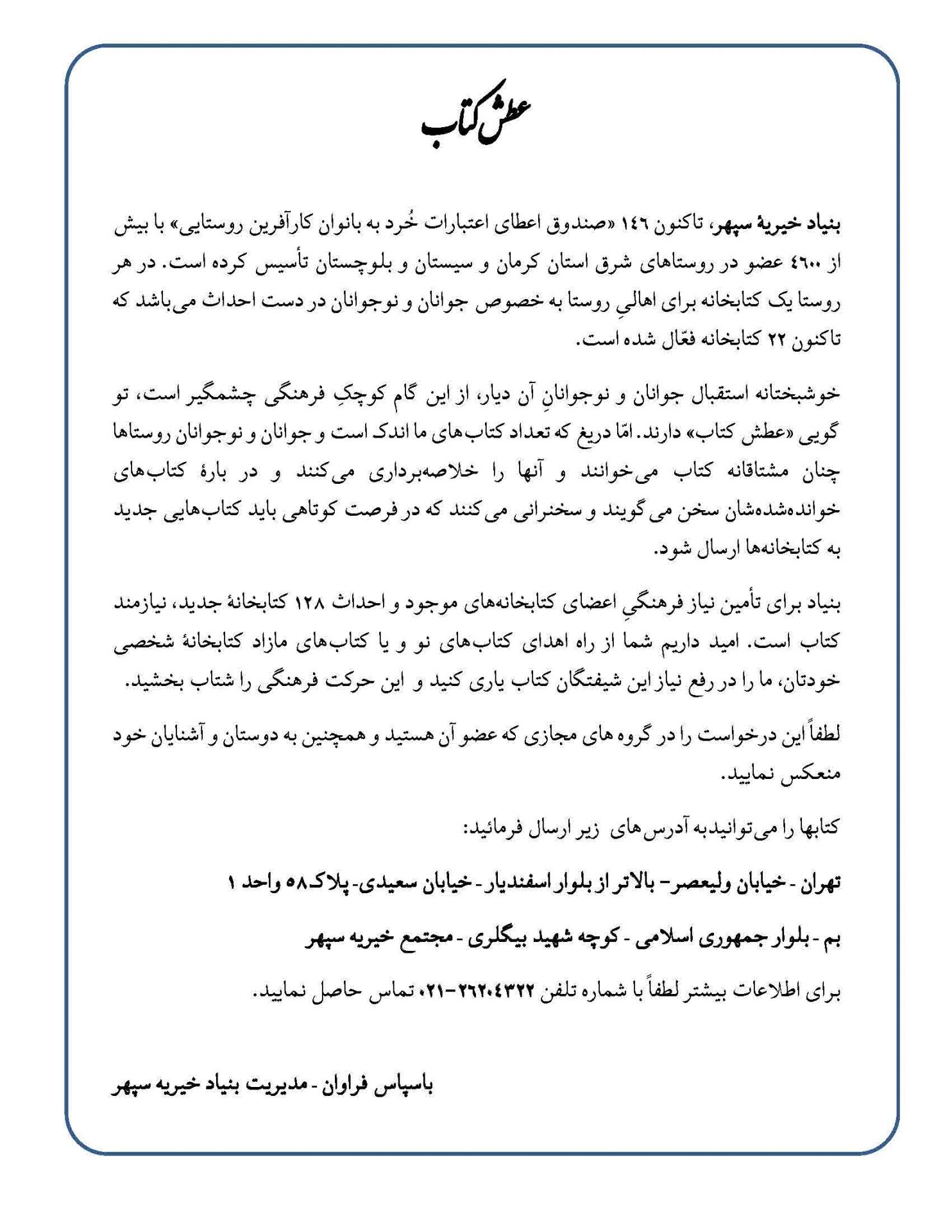 مرکز حرفه آموزی دخترانه بالای 14 سال بنیاد خیریه سپهر در بهمن ماه 1402 آثار نقاشی توانخواهان را در گالری نقاشی داوری پناه به معرض نمایش و فروش عموم گذاشته است.