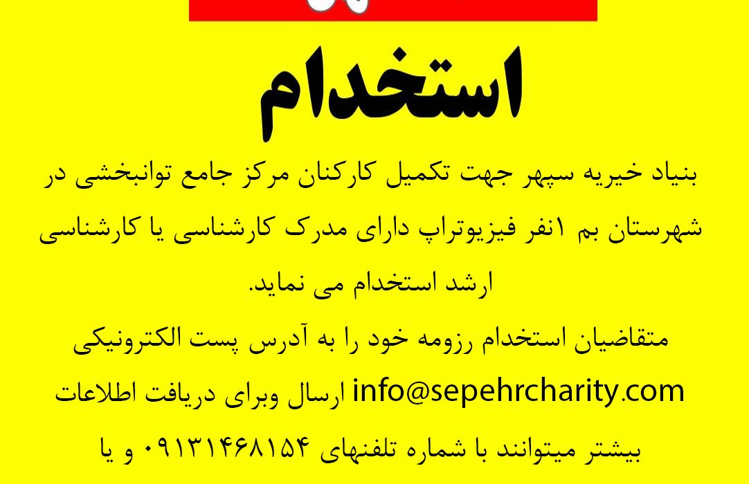 6 سال قبل برچسبها استخدام فیزیوتراپ بم آگهی استخدام در صورت تمایل به همکاری و داشتن شرایط لازم لطفا رزومه خود را به ادرس مربوطه ارسال و یا با